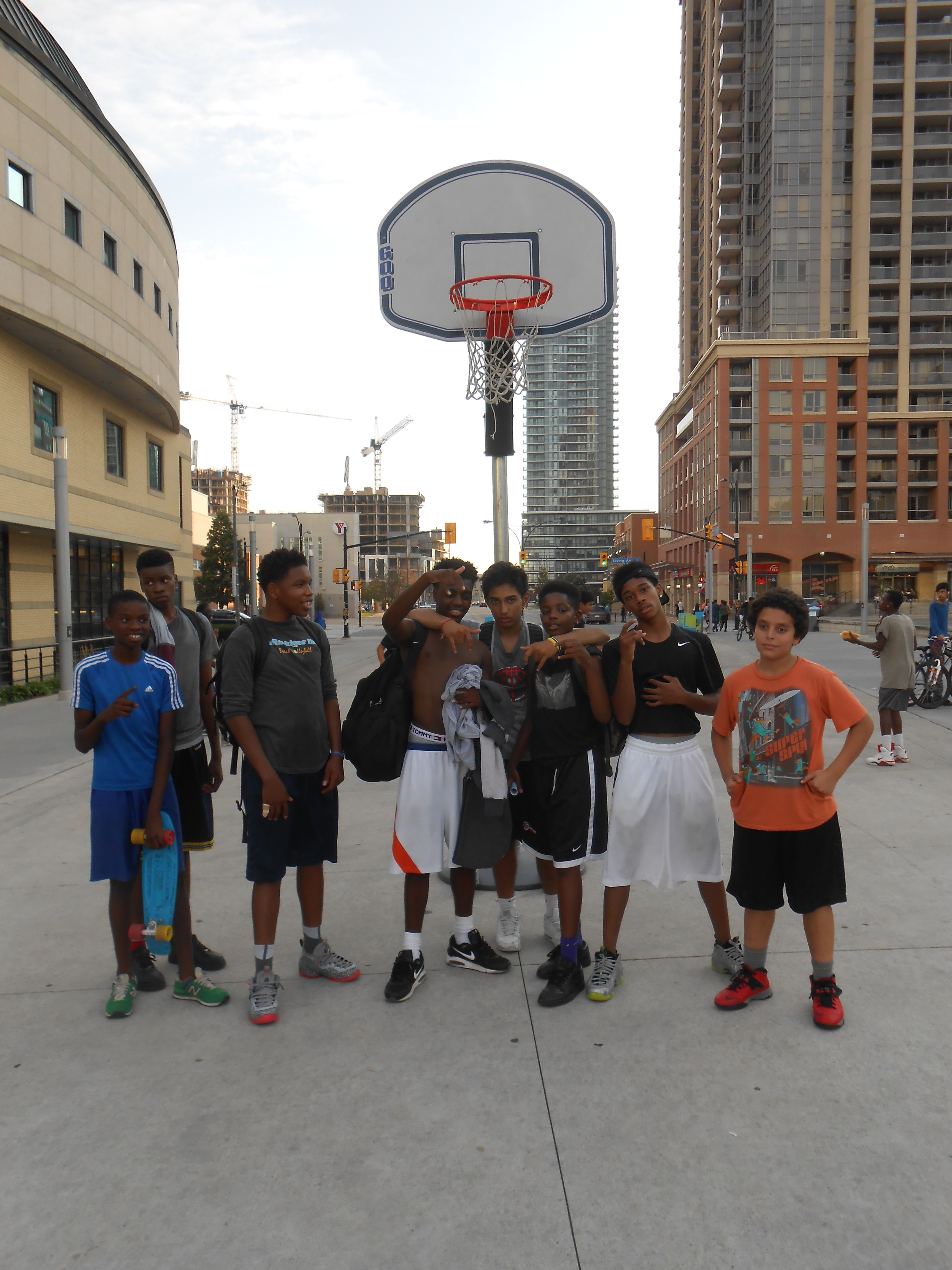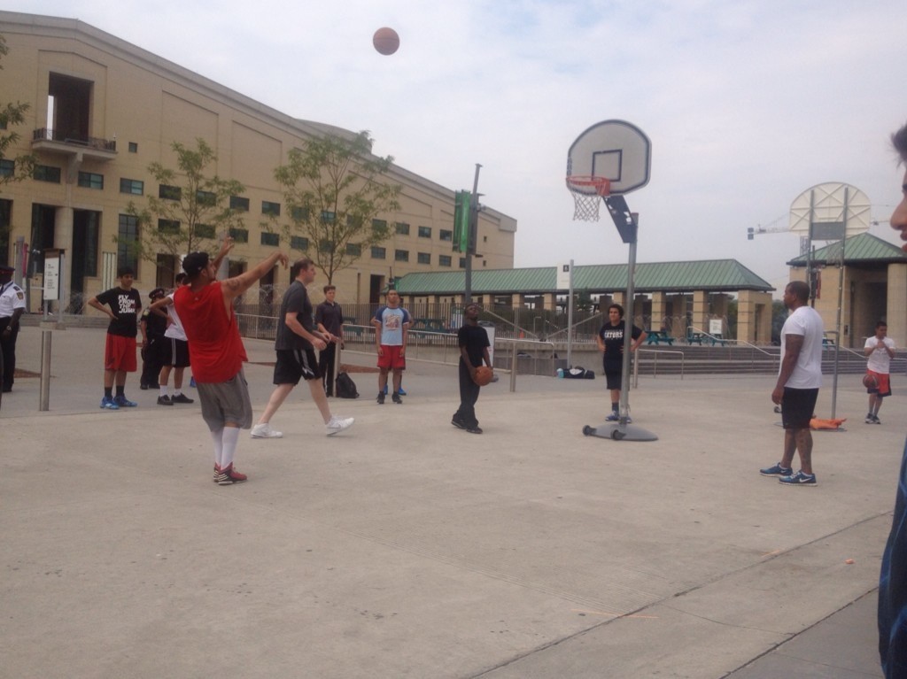 The following is a guest post by Sam Tibshirani, who is an associate in RBC’s Career Launch program for new graduates. Sam is currently on a 3-month placement with Nexus’s sister agency, Peel Children’s Centre. Below, Sam shares her experience volunteering for Nexus and supporting youth outreach and engagement during one of its most popular annual events.On Tuesday, August 18th, 2015 I had the pleasure of volunteering at the 4th Annual Nexus Youth Services Basketball Tournament in Mississauga’s Celebration Square. Encompassing the space between the arched fountain and the infamous green space, the courts were over looked by the Nexus Youth Centre located inside the Central Library on the second floor. The Centre is tucked away and doesn’t get a lot of visual exposure, but this event drew onlookers far and wide. It was hard to miss a crowd of young people enjoying a full afternoon of hoops and grub.